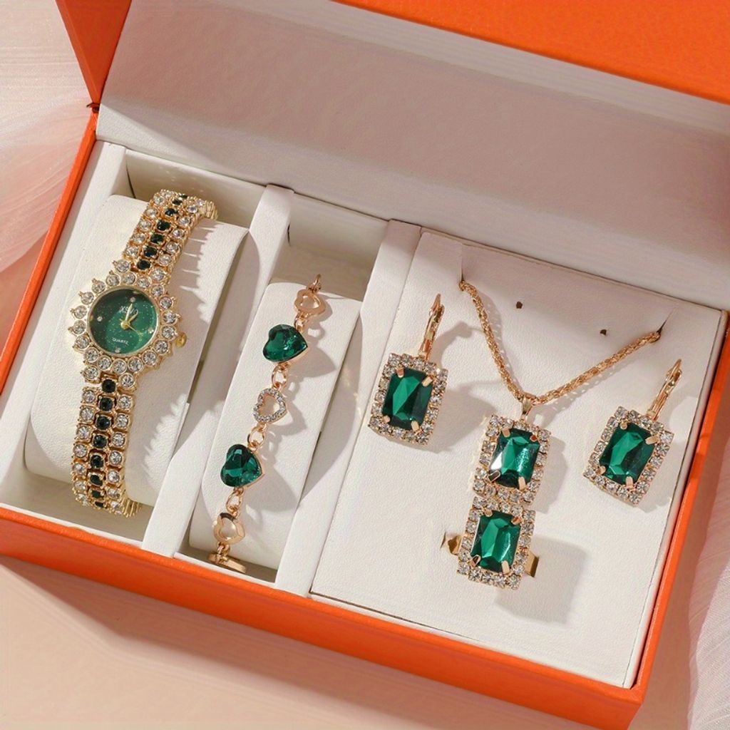Para a mãe que merece tudo o melhor: relógio de mostrador verde com design delicado e anéis complementares, tudo em um conjunto de 5 peças. A caixa de presente torna a entrega ainda mais especial, perfeita para celebrar momentos como Dia dos Namorados ou Halloween.